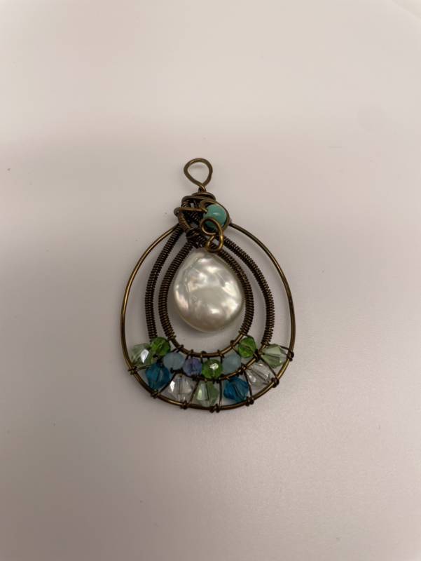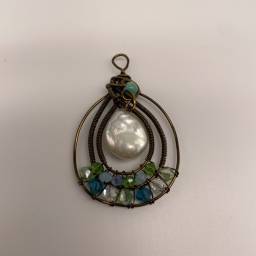 | 陶片花圈吊飾 | 以五彩的軟陶片加水晶珠串成花圈形狀,也可以做二個變成耳環 |
