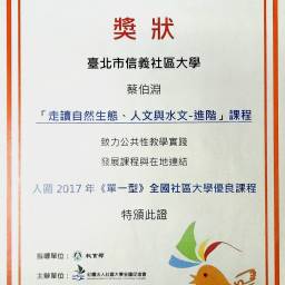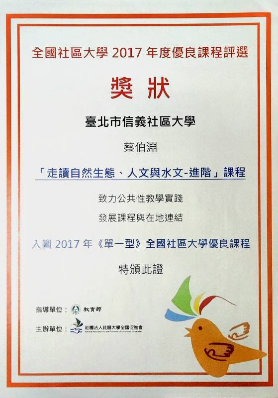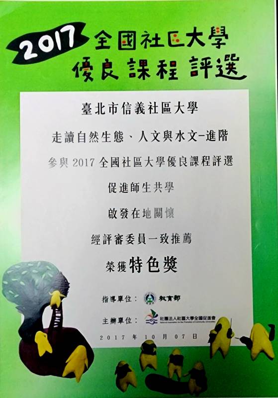 | 第五週 | 5 | 04 / 01 張蕙萍 貓空茶香環狀步道 | 小天空步道、健康步道、茶展中心步道以及壺穴步道 & 貓空的豐富自然生態及人文地質景觀 / 戶外 半天 |