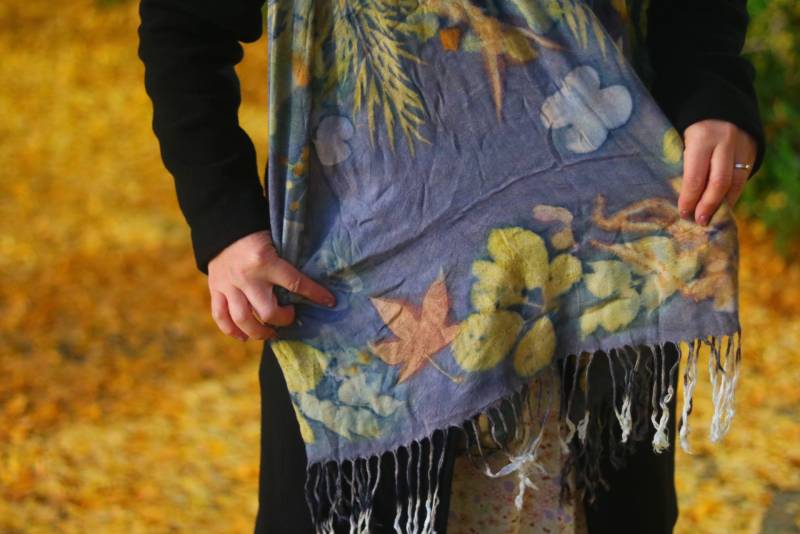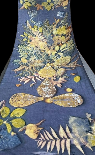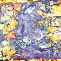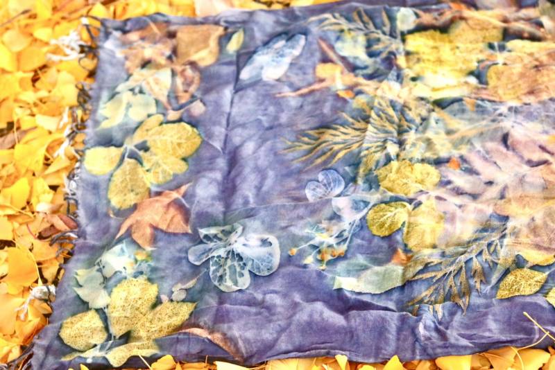 | 時尚圍巾 | 認識 不同材質的布料及中藥材 學習各種植物配置讓畫面和諧 瞭解媒染劑的運用 觀察不同染劑在花葉的移印效果 |